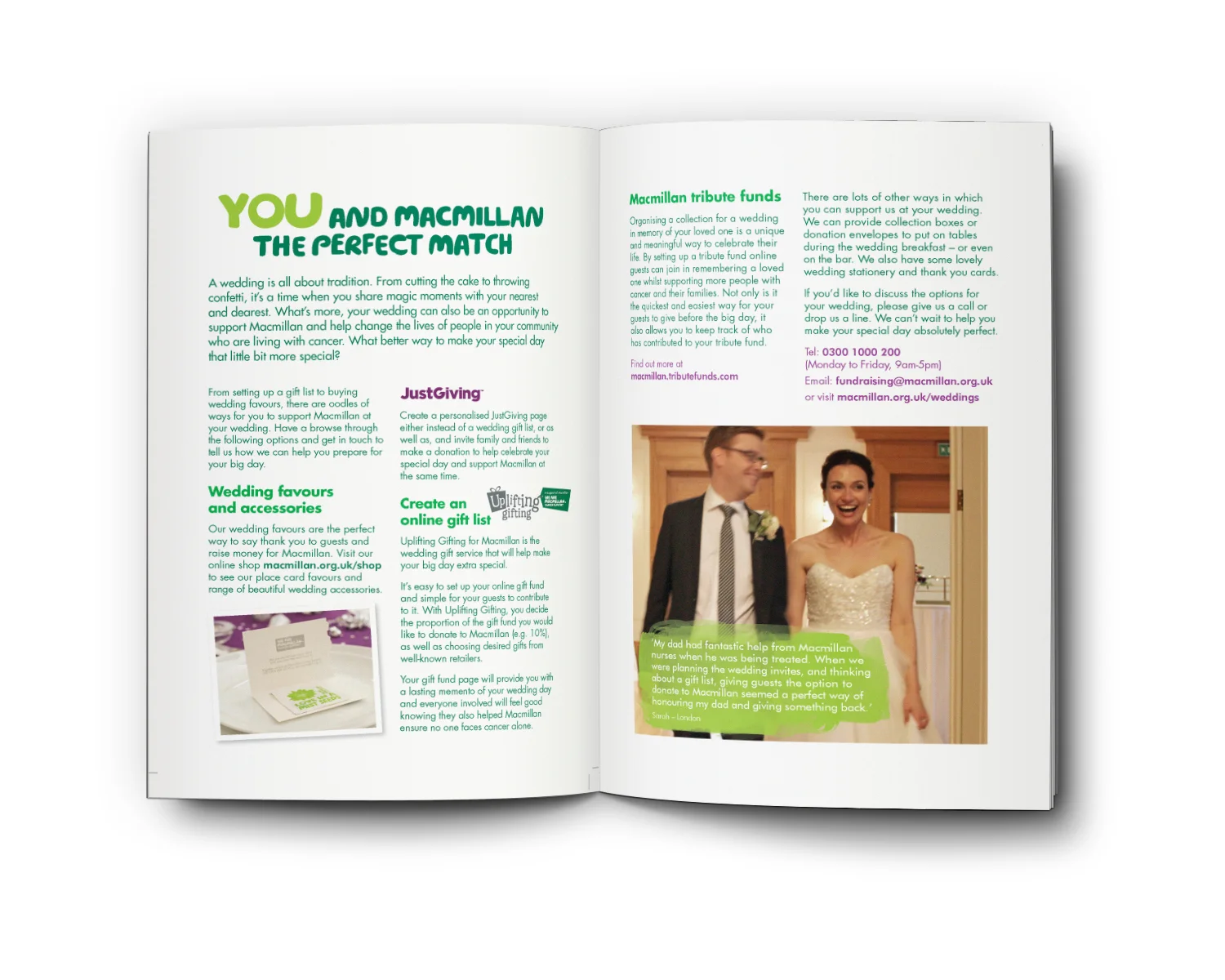 Identity and brochure for Macmillan, giving supporters the opportunity to donate to the charity through their wedding day.